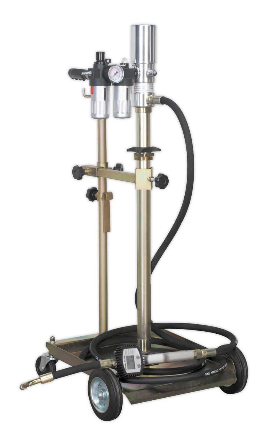 - Mobile oil dispensing unit with air operated 3:1 double acting pump for gear oil with 2″BSP fittings.