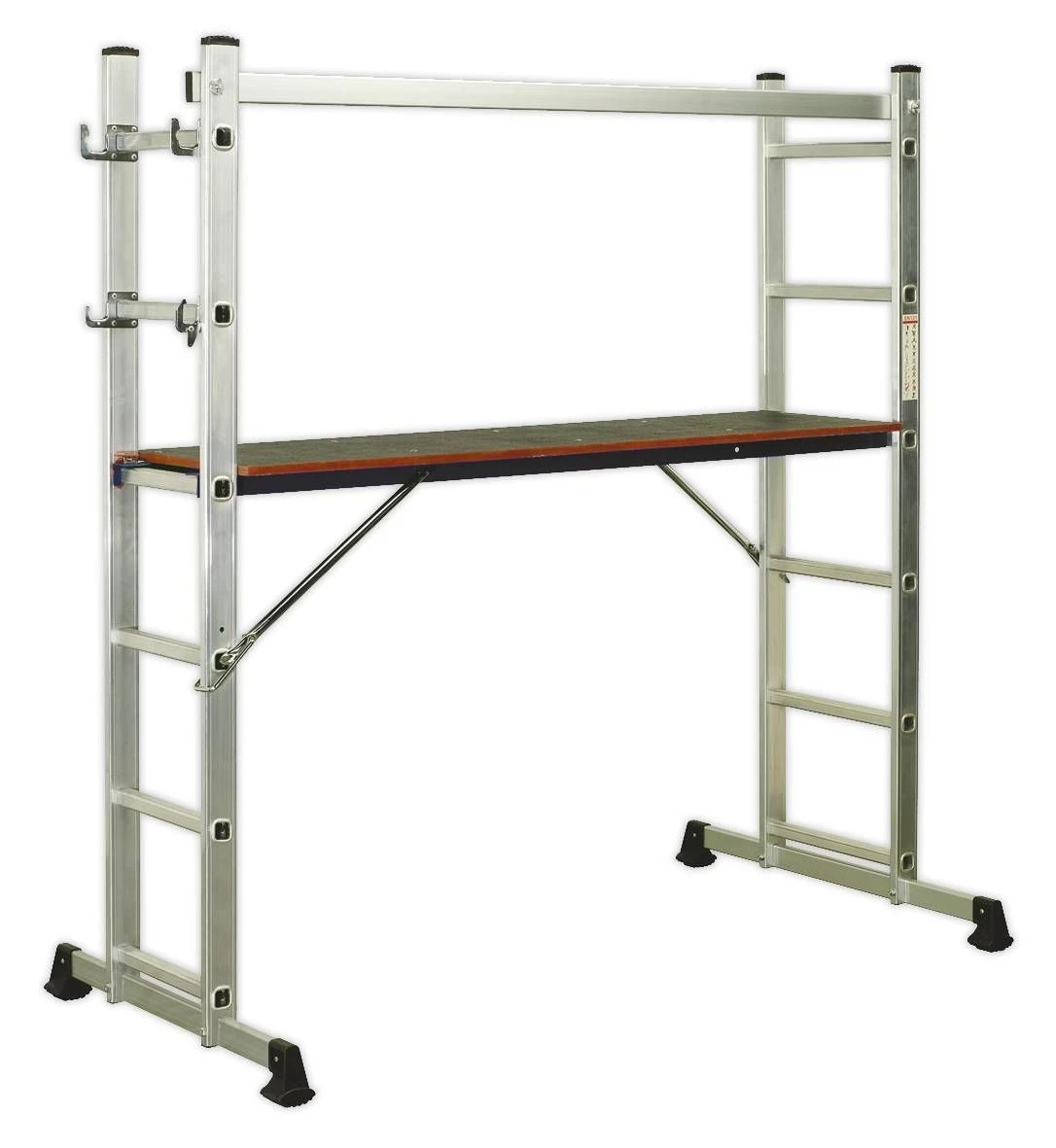 - Two six-rung aluminium ladders can be used as extending ladder, single ladders, step ladder or complete scaffolding unit.