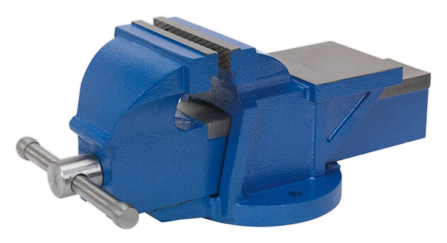 - Bench mounting, heavy-duty vice with cast iron body and replaceable, serrated steel jaws.