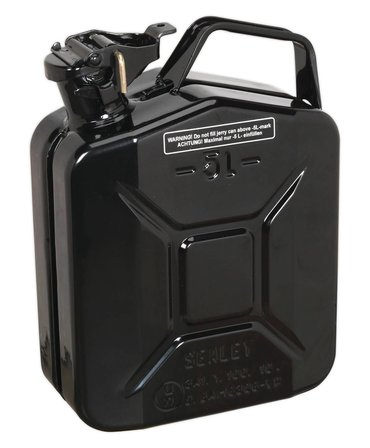 - Black jerry can with 5ltr capacity manufactured from 0.9mm pickled steel sheet with fuel resistant lining.