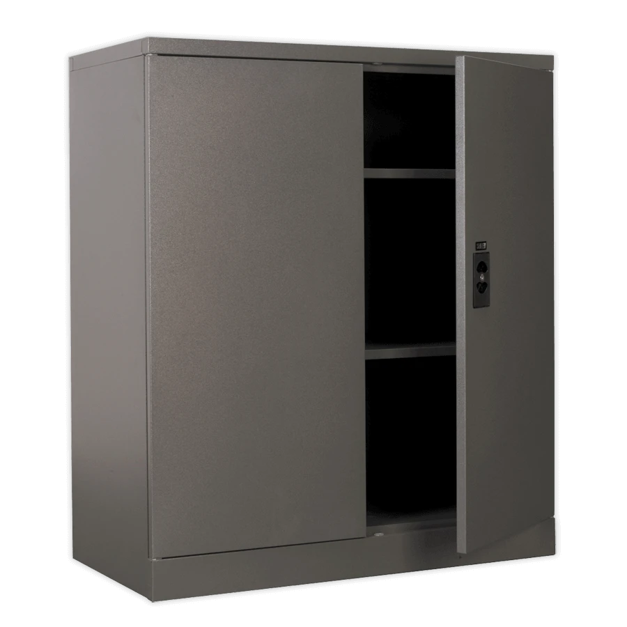 - Featuring two large doors, two full shelves and base storage.