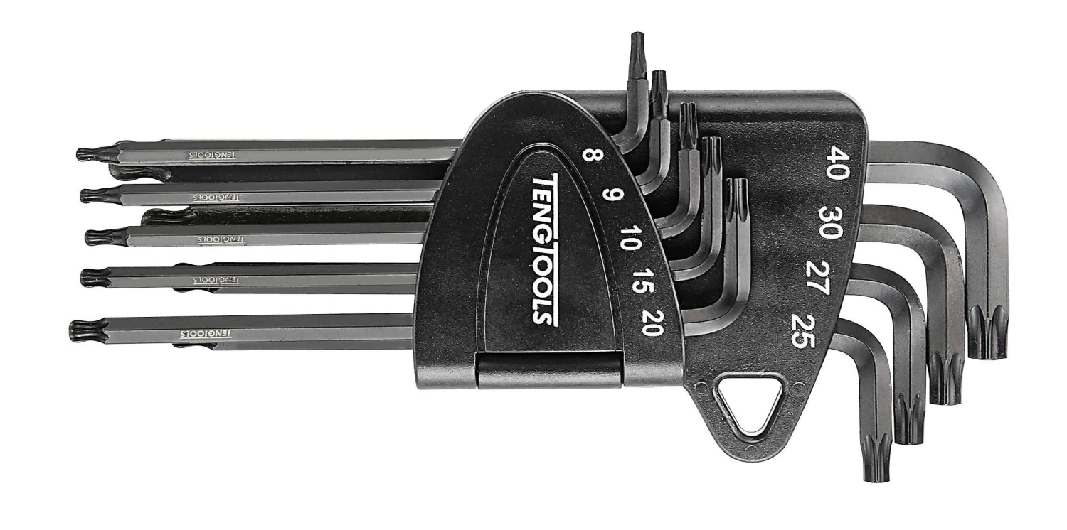 9 piece TX key set. The TX keys feature a ball point head on the long hex key end for 20° access and are supplied in a folding plastic holder. Made from chrome molybdenum steel for added strength.