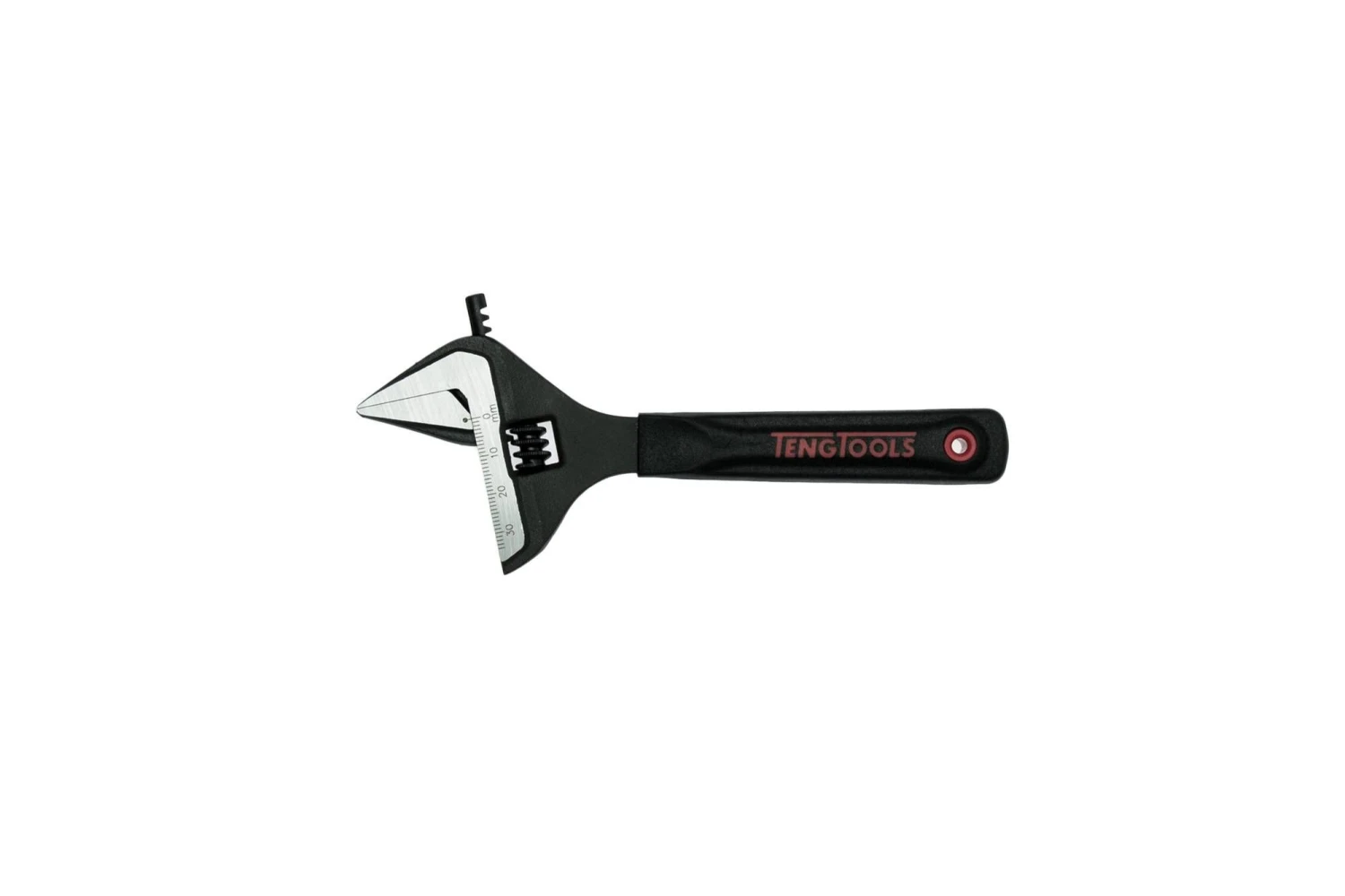 Adjustable wrench with an extra wide jaw opening. Features a 15° jaw angle and an ergonomically designed two material handle grip with a phosphate finish and a graduated scale on the jaws. Made from chrome vanadium. Exceeds international standards ISO6787-1982, ASME B.107.8-1996, BS6333-1995, DIN3117-1988, JIS B4604-1976.