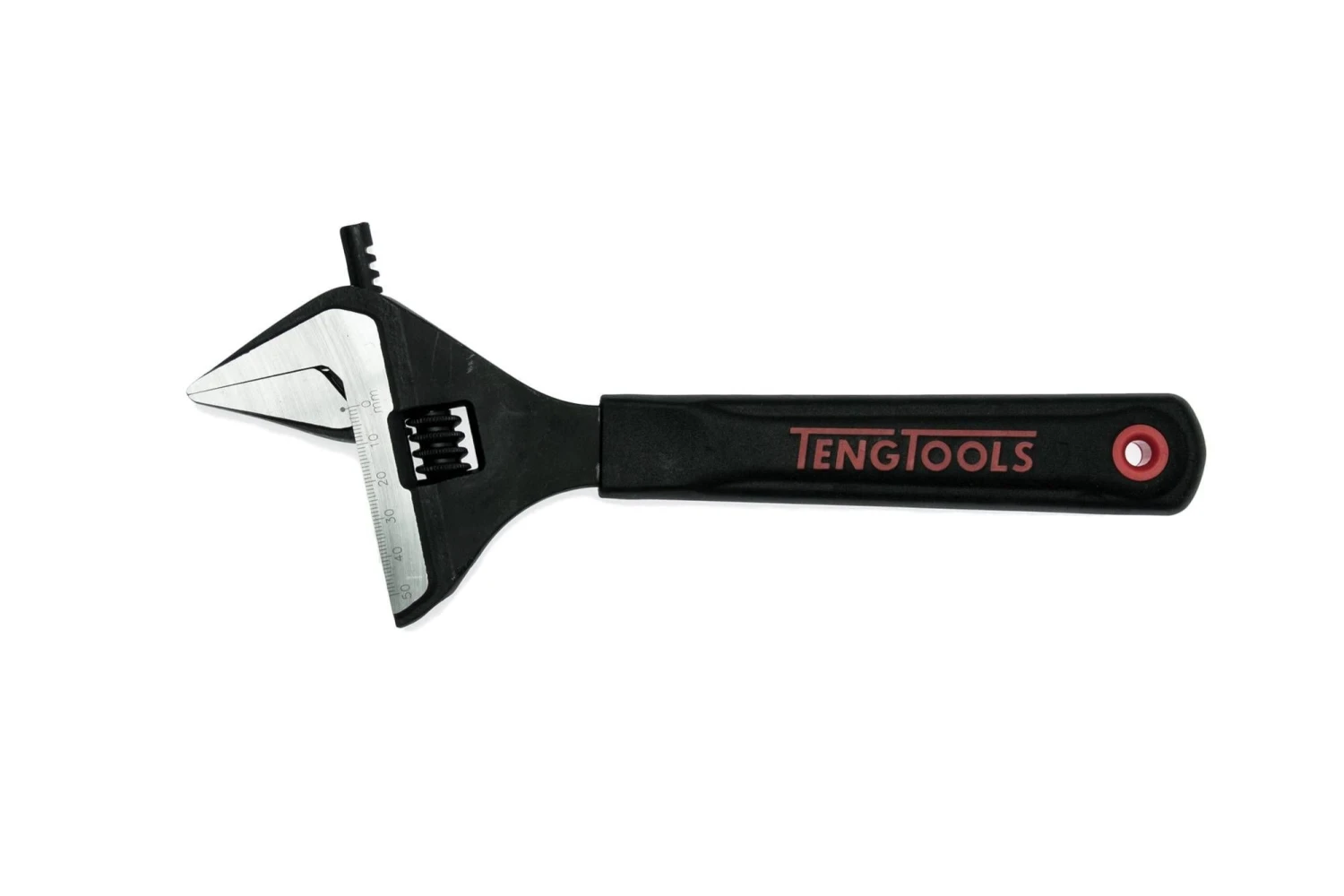 Adjustable wrench with an extra wide jaw opening. Features a 15° jaw angle and an ergonomically designed two material handle grip with a phosphate finish and a graduated scale on the jaws. Made from chrome vanadium. Exceeds international standards ISO6787-1982, ASME B.107.8-1996, BS6333-1995, DIN3117-1988, JIS B4604-1976.