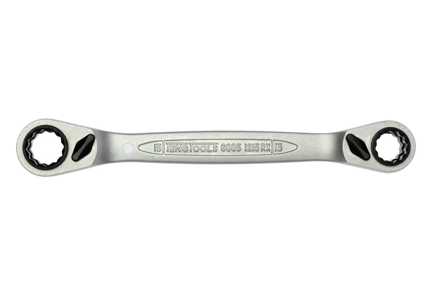 13 point ratcheting ring spanner with 2 sizes and flip reverse function at each end. Satin finish.