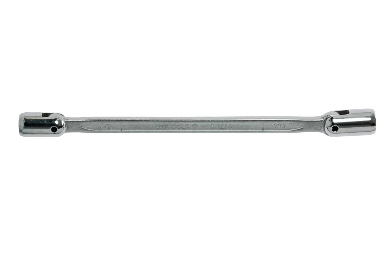 Double flex wrench with different size 12 point sockets at each end. Made from chrome vanadium with a satin finish.