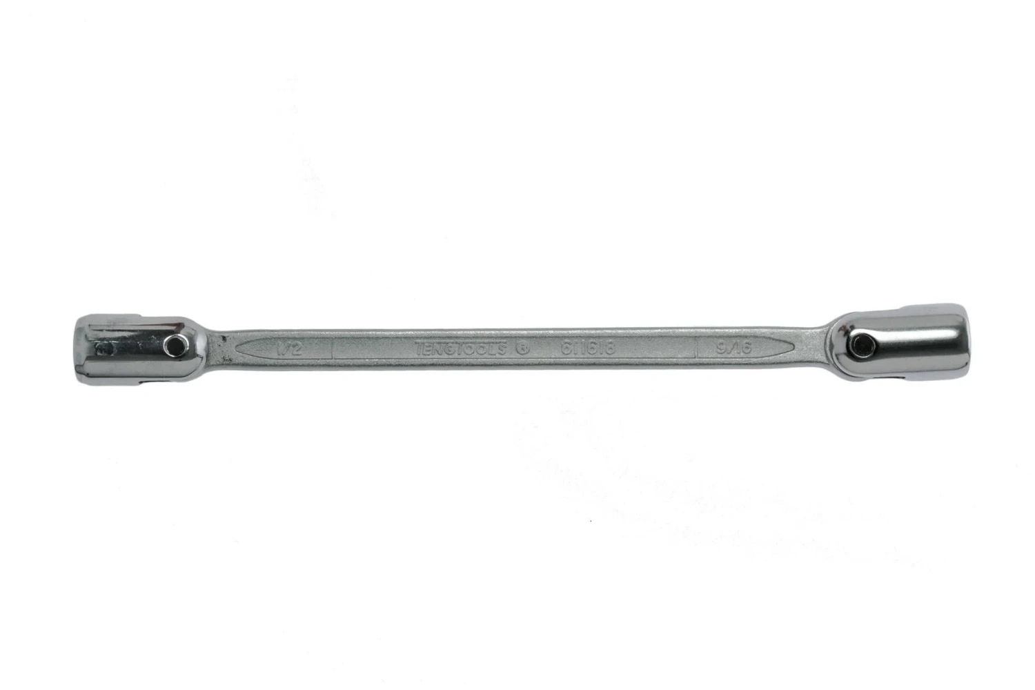 Double flex wrench with different size 12 point sockets at each end. Made from chrome vanadium with a satin finish.
