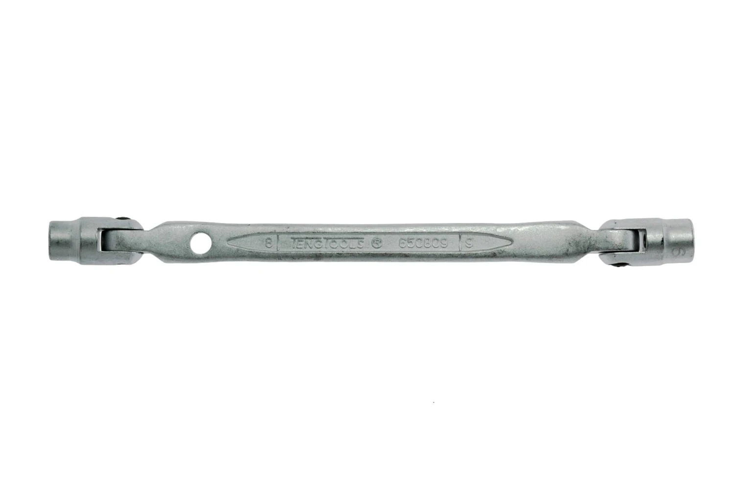 Double flex wrench with different size 12 point sockets at each end. Made from chrome vanadium with a satin finish.