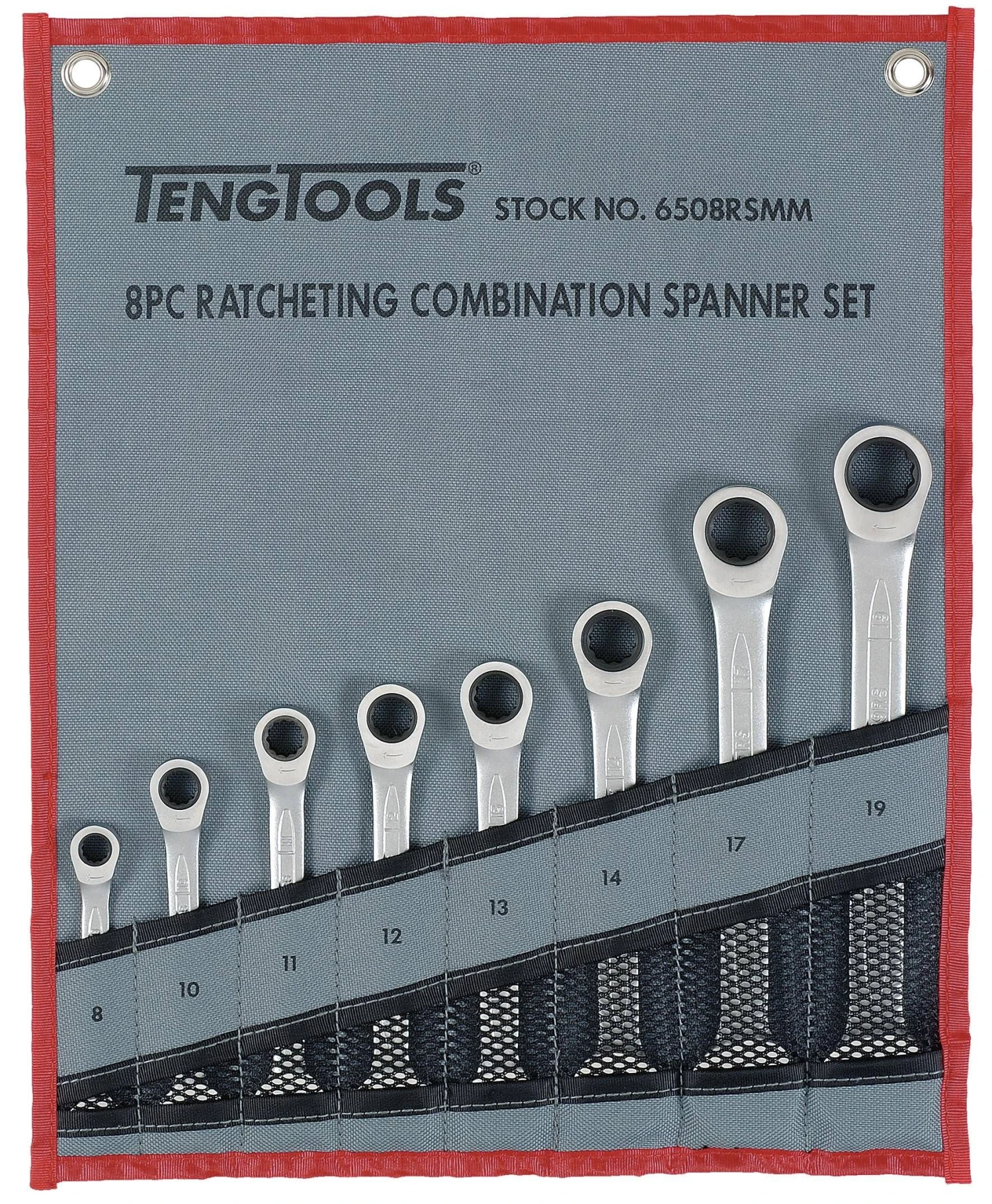 8 piece combined ring/open ended ratcheting combination spanner set. The spanners feature the same sizes at both ends, a 12 point ring and 72 ratchet action for rapid tightening and loosening. Made from chrome vanadium with a satin finish.