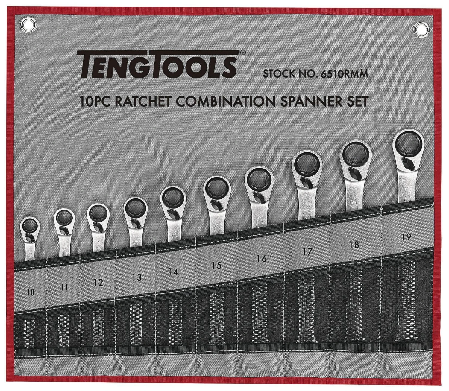 10 piece ratcheting combination spanner set. The spanners are combined ring/open ended, feature a 12 point ring and have the same size at both ends. The ratchet is flip reverse and the spanners are offset by 13° for use on flat surfaces. Made from chrome vanadium with a satin finish and supplied in a handy storage wallet.