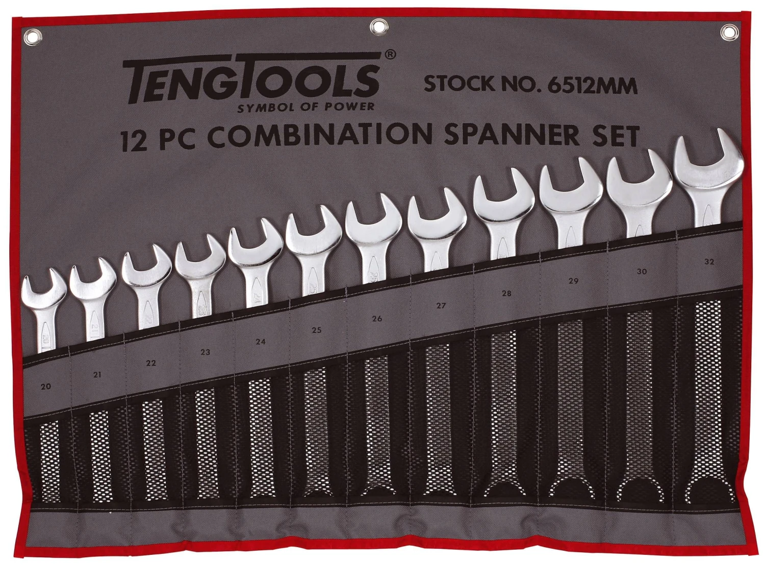 12 piece metric combination spanner set with the same dimensions at both ends. The 12 point ring head is set at a 15° angle. The spanners feature polished heads with a satin finish and are supplied in a handy tool roll.