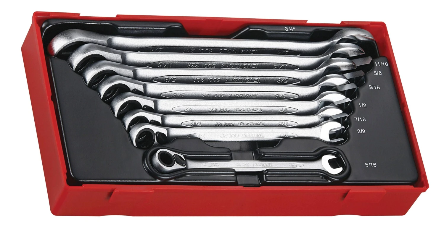8 piece ratcheting AF combination spanner set with the same size at both ends. Combined ring/open ended spanners with a 12 point ring. The ratchets are flip reverse and offset by 13° for use on flat surfaces. Made from chrome vanadium with a satin finish. The set is supplied in a unique Teng Tools TC tray and can be used either on it’s own or as part of the Teng Tools TC control system. The tray features a removable hinged click lock lid and dove tail joints which enable different TC trays to be locked together and used as trays in Teng Tools tool boxes and roller cabinets. All of the tools in the set have their own individual place so lost tools can easily be identified. (265x142x50mm, 1.18 kilos).